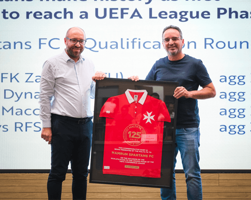 Malta FA President Bjorn Vassallo presented a commemorative shirt to Ħamrun Spartans FC President Joseph Portelli, marking the club’s remarkable European journey.